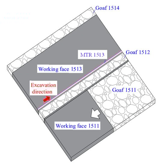 As shown in Figure 1, goaf 1512 and goaf 1514 were located at two sides of the working face 1513, surrounded by an isolated island working face, called “isolated island working face”. The test roadway was MTR 1513, which was excavated by setting 6 m coal pillar at the edge of goaf 1512. During the excavation, the working face 1511 was being mined, whose mining direction was opposite to that of MTR 1513. Due to the small width of goaf 1512, the mining of working face 1511 will cause lateral stress disturbance on the MTR 1513, so the MTR 1513 belongs to gob-side roadway driving with small coal pillar facing mining in the isolated island working face under the alternate mining of wide and narrow working faces. Due to its particularity and complexity, the engineering of geological conditions of gob-side roadway driving with small coal pillar facing mining in special island working faces is very rare in China.