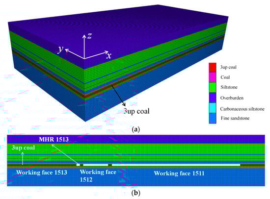 Based on the engineering background of MTR 1513, working face 1512, and adjacent working face 1511, the FLAC3 D finite element numerical calculation model (Figure 3) was established to study the stress disturbance law of MTR 1513 under the mining influence of adjacent working face 1511. The model is 400 m in length (x direction), 80 m in height (z direction) and 200 m in width (y direction), among which 200 m in width of 1511 working face, 40 m in width of working face 1512, and 4 m by 3.4 m in width by height of MTR 1513. All the element meshes of the model are rectangular meshes, with a total of element meshes. According to the buried depth of coal seam, the simulated ground stress of coal seam is 12.675 MPa, the gradient in the vertical direction of vertical stress is 0.025 MPa/m, and the lateral pressure coefficient is 1.1. The Mohr–Coulomb criterion was used for model calculation. Lithology occurrence and mechanical parameters are shown in Table 1 [16,17].