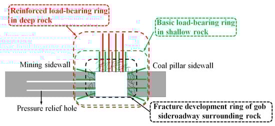 The fractures in the surrounding rock of the gob-side roadway were developed and seriously damaged. After the roadway was excavated, there will be a ring with relatively developed fractures in the surrounding rock of the roadway. Through increasing the length of roof and coal wall bolts, the bearing ring of shallow rock foundation was constructed, which could pass through the rock mass fracture ring to the stable rock stratum with small deformation. The small displacement of deep rock stratum was used to restrain the large displacement of shallow rock stratum, to realize the linkage of large displacement and small displacement [18,19,20].
