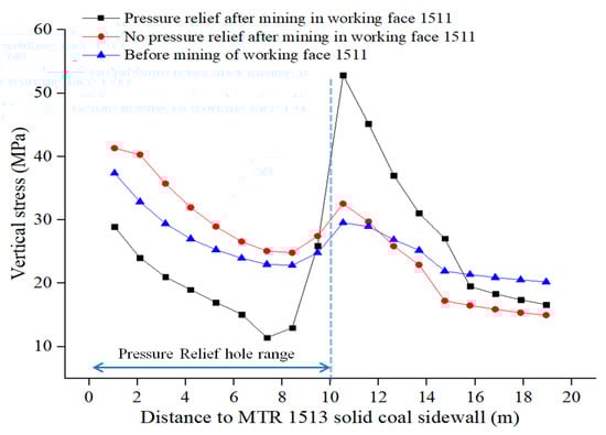 Comparison of vertical stress of solid coal side roof of MTR 1513 before and after pressure relief.