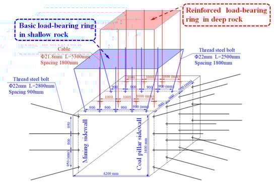 According to the FLAC3D numerical simulation results in Section 3.1, the mining of 1511 working face caused strong stress disturbance to MTR 1513. Especially for the roadway roof, the ability of single anchor layer to resist stress disturbance was low. Therefore, on the basis of constructing the bearing ring of shallow rock foundation, a reinforced bearing ring of deep rock mass was formed by arranging the roof anchor cable in equal rows with the anchor bolt [21,22], which anchored the bearing ring of shallow foundation with the deeper stable rock mass to form the coordinated bearing support technology of a thick roof anchored with a double circle layer. It not only avoided the concentrated development of separations and fractures on the support interface when the anchor horizon was simplified, but also strengthened the ability of roof rock to resist stress disturbance (Figure 6).