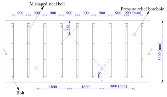 (2) Coal rib supporting: four Φ22 × 2800 mm right-handed full-threaded bolts with M3 steel belt were used for each row of the two sides of the roadway. The row spacing of anchor bolts was 1800 mm, the top and bottom angle bolts of coal side were installed at an inclination of 15°, and all other anchor bolts were installed perpendicular to the roof. Each anchor was anchored with a MSCK 2370 mm resin anchorage, with a pre-tightening force of 40 kN.