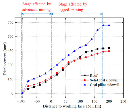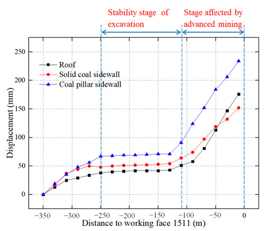 The auxiliary transportation roadway 1511 (ATR 1511) was also a small coal pillar gob-side roadway driving in this special isolated island working face, which was consistent with the engineering geological conditions of MTR 1513. Therefore, this section analyses the deformation characteristics of surrounding rock of ATR 1511 under the influence of mining stress. The deformation law of ATR 1511 is shown in Figure 2 (obtained from in situ monitoring). The negative number in the abscissa represents the displacement monitoring point in front of the adjacent mining work, while the positive number represents the displacement monitoring point in the rear of the adjacent mining face.