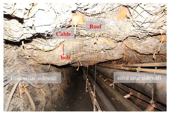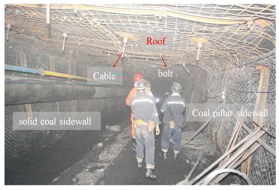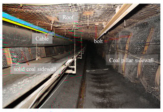With a determined width of coal pillar, research on the supporting problem of gob-side roadways has mainly focused on the time–space relationship of mining, the determination of support parameters, and pressure relief technologies. In terms of mining time and space, Bai et al. reported that the middle part of the roof was the key point of support in gob-side roadway driving with small coal pillar facing mining, and put forward three key technologies to improve supporting efficiency, as follows: setting a reasonable coal pillar width; stopping driving in dynamic pressure-affected areas under face mining and restart driving at the end of influence; providing dynamic support in stages [8]. Ma et al. studied the reasonable space–time relationship between gob-side roadway driving and mining face, finding the following: when driving is conducted, the reasonable delay distance of roadway is 136 m and the delay days should not be less than 36 days; when driving and mining are in opposite directions, the distance between the roadway and the stop line should be less than 50 m [9]. In terms of the determination of support parameters, Zhang et al. put forward the ‘trinity’ coupling support technology of gob-side roadway driving, that is, using high prestressed screw steel bolt supports in advance in the goaf side. Moreover, a short bolt support was applied to the coal pillar in the gob driving roadway, and a deep injection is applied to the coal body to strengthen the anchoring point, so as to restrict the expansion of the coal body [10]. Yin et al. proposed the supporting technologies of a roof anchor truss and a narrow coal pillar anchor beam for gob-side roadway driving with small coal pillar, which achieved a good supporting effect in situ [11]. Yang et al. pointed out that in the gob-side roadway with small coal pillar, supporting conditions differed largely in roof, solid coal side, and narrow coal pillar side. Asymmetric control technology with different density of surrounding rock support was proposed, in which the support density of narrow coal pillar was increased [12]. In terms of pressure relief technology, after studying the relationship between the filling body of gob-side roadway retaining and the fracture position of key roof blocks, Li et al. pointed out that when the roof strata were pre-splitting, the optimal direct roof strength that could promote the stability of the filling body could be obtained, which clarifies the significance of pre-splitting roof strata at an appropriate position [13].