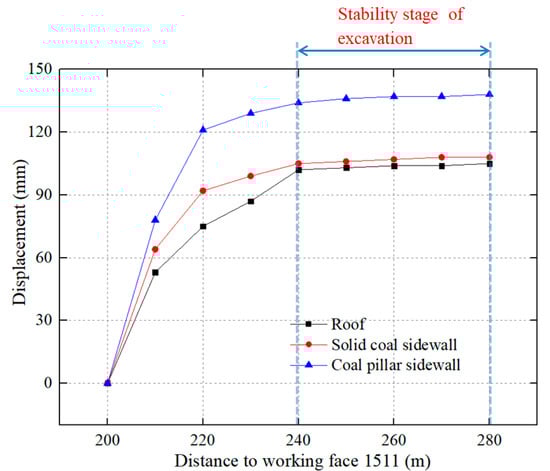 (2) The first stage was the advanced mining influence stage of working face 1511. In this stage, the displacement of roadway surrounding rock continued to increase under the influence of advanced mining, and the maximum displacement of roof, solid coal side, and coal pillar side were 187 mm, 172 mm, and 264 mm, respectively.