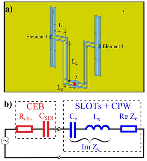 (a) Double-slot antenna single cell design: 1—slots; 2—receiving port cold-electron bolometers (CEB); 3—metal layer. Here the slot length is 162 um and the length of the coplanar line is L = 2 · (L1 + L2 + L3), and is equal to 360 um, which corresponds to the sample photo in Figure 3. (b) CEB connected to a double-slot antenna, equivalent circuit.