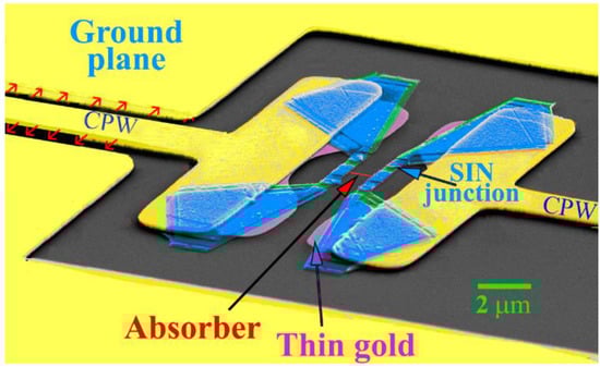 Cold-electron bolometer represents double SIN (SIN—superconductor-insulator-normal metal) junctions Al/Al2O3/Fe-Al/Al2O3/Al with normal metal nanoabsorber made of aluminum, whose superconductivity is suppressed by a 1 nm thin underlayer of Fe. The radiation through the antenna comes to the superconducting leads of the bolometer, and through a tunnel junction capacitance heats electrons in the normal metal nanoabsorber. The ‘hot’ electrons then tunnel through the barrier, forming the response current. With this current, ‘hot’ electrons are removed from the absorber decreasing its electron temperature, thus improving sensitivity and dynamic range [7]. CEBs with antenna systems were fabricated at Chalmers University of Technology. The substrate is made of silicon, the dielectric layer is made of SiO2. Figure 2 shows a SEM image of a fragment of the chip, which consists of a cell with CEB and a two-slot antenna with coplanar lines.