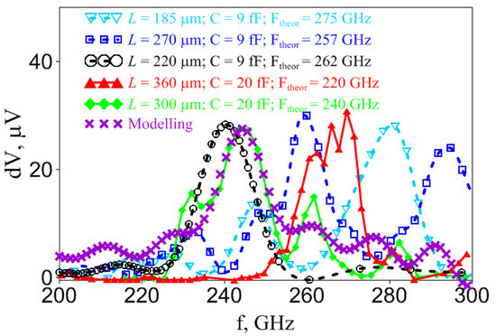 Figure 4 presents the results of an experimental study of the resonant properties of CEBs with a double-folded slot antenna and coplanar lines. To develop a resonant receiving system at given frequencies, it is necessary to adjust the elements of the system, in particular, the capacity of the SIN junction in CEB and the length L = 2 · (L1 + L2 + L3) of the central coplanar line (see Figure 1). During the experiments, the effect of changes in these system parameters on the operating frequency was tested (Figure 4). We have also analyzed various designs of coplanar lines with rectangular turns as in Figure 3 (solid curves) and with rounded turns (dashed curves). It can be seen that by selecting the capacitance and lengths of the coplanar lines, the system can be tuned to the specified frequency range. It is seen that all characteristics have a clearly defined peak at different frequencies with a bandwidth of around 15 GHz. So, the resulting bandwidth of 6–9% practically meets the requirements for the LSPE experiment receiving system. Out of band peaks can be attributed both to peaks of YBCO amplitude-frequency characteristic and to the methodic of CEB sample irradiation. Due to the necessity to test the first on-chip filter prototypes we have placed up to 6 samples with various antennas on one chip and certain receivers are shifted from the chip center and standing waves differently affect various antennas. These issues will be corrected in future designs of both YBCO sources with more suitable broadband antennas and new designs of CEBs with on-chip filters with only one antenna at the chip center. Nevertheless, our experimental setup where the generator lens was mounted close to the receiver lens separated by infrared filters, allowed significantly reducing spurious resonances, which inevitably arose in experiments with room temperature sources of GHz radiation outside the cryostat [15] due to additional reflections from cryostat shields and much larger power.