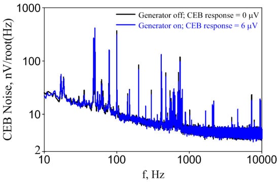 Figure 5 presents the comparison of CEB output voltage noise in the absence and in the presence of YBCO GHz signal. It can be seen that the noise level does not change due to rather weak external signal power (on the order of 1 pW, which was got from fitting as in [23]), received by the CEB, and narrow spectral linewidth of YBCO oscillator, operating at 4 K temperature. The total voltage noise of a bolometer δVtot consists of three components: the noise of the amplifier δVamp, the noise of the bolometer itself δVCEB and the noise of an external signal δVex, thus δVtot2 = δVamp2 + δVCEB2 + δVex2. Measured total noise (pedestal level) in the absence of an external signal at the frequency of 120 Hz is 8.5 nV/sqrt(Hz) (see Figure 5). Taking into account that the amplifier noise δVamp = 5 nV/sqrt(Hz), this means that the intrinsic noise of the bolometer δVCEB = 6.9 nV/sqrt(Hz) is slightly larger than the amplifier noise δVamp. When an external high-frequency signal is applied, the total noise of the bolometer may increase due to the amplitude and phase noise of the external generator (as it was in our experiments with the backward wave oscillator [15]) or due to photon noise δVph. The absence of changes in our case, Figure 5, indicates high stability of the source based on the high-temperature YBCO Josephson junction. On the other hand, we also do not observe the contribution of photon noise. It was shown [23] that for a power load of 5 pW the total noise-equivalent power of a single CEB with room temperature amplifiers AD745 equals 10−16 W/sqrt(Hz) and is larger than photon NEP. That is why we did not see noise growth in our experiments.