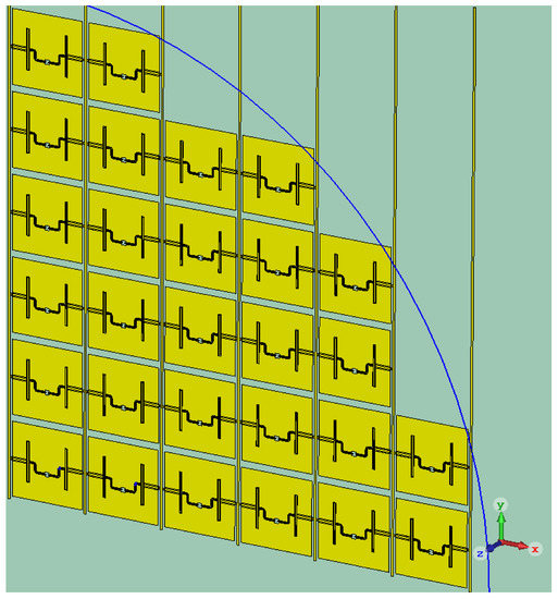 Totally, there are three technological stages. The first one is for golden DC connection lines under cells ground planes. The second one creates insulation for these lines, providing no connection between DC wires and ground planes. At the third stage, we make ground planes with double-slot design and coplanar lines. Major DC connection wires are also created at this stage. A quarter of the rounded array used for calculations is shown in Figure 6.