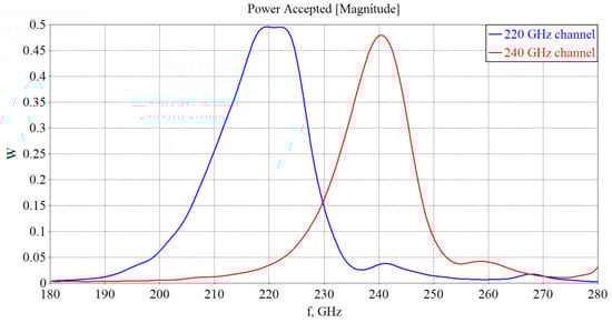 Figure 7 shows the accepted power versus frequency curves for all CEBs of the array at 220 and 240 GHz frequency channels, respectively. The bandwidth for the 220 GHz channel at half of the accepted power is about 18 GHz or 8.2%, from 210 to 228 GHz. It is quite close to meet the requirements for LSPE. The deviation from the required bandwidth is mostly at the lower frequencies, so to decrease the bandwidth an additional external filter can be used. The 240 GHz channel bandwidth is very close to meet LSPE project requirements. At half of the accepted power, the bandwidth is about 14 GHz or 5.8%, from 232.5 to 246.5 GHz. The absorption efficiency of the array has reached 81% and 77% for 220 and 240 GHz channels, respectively. The work on optimization of frequency response for 220 and 240 GHz channels is being continued.