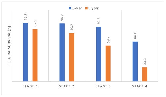 Relative survival by stage of diagnosis and cancer types, period of diagnosis 2007–2011 and followed up to 2016, Malaysia [5,10].