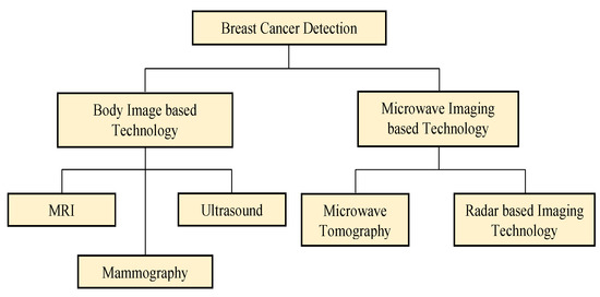 The primary key in women’s survival from breast cancer is early detection and proper treatment [20,21]. Many existing screening and emerging technology tools are used for the detection of the early stages of breast cancer. As illustrated in Figure 3, the current breast cancer detection tools are classified into two categories: body imaging-based technology [22] and microwave imaging-based technology [23].