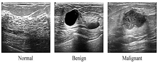 Ultrasound imaging (sonogram) is a medical tool that uses a high frequency of sound waves (echoes) to obtain real-time images of the body’s internal structures or detect suspicious nodular formations without involving ionizing radiation compared to MRI and mammogram. Ultrasound is a low-cost and non-invasive procedure for patients. There are two significant functions of ultrasound which are for diagnostic of internal body and pregnancy. The frequency range commonly employed in medical ultrasound is 2 to 18 megahertz, hundreds of times above the human hearing range [34,35,36]. A transducer is a device that rubs the patient’s skin across the area being investigated during an ultrasound. Although ultrasound is often used to prevent an invasive measure for diagnosis, sometimes it may overlook detecting the smaller size of masses that will carry false-positive and false-negative results. Ultrasound is suitable for women below 45 years and women with dense breasts, while mammography has progressive sensitivity in women 60 years and above [37]. The samples of ultrasound breast images are illustrated in Figure 4 and categorized into three classes, which are normal, benign, and malignant.