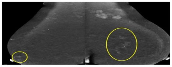 Mammogram, also called mastography, is a low-dose energy X-ray (ionizing radiation) procedure to produce images (radiographs) of the breast. It can be used to screen or diagnose people who are symptomatic (have symptoms of illness) or asymptomatic (have no symptoms of illness) [39]. Ordinary radiation dose around 0.4 millisieverts (mSv) or 30 peak kilovoltage (kVp) for two views of each breast [40,41]. 2D mammograms only compress the breast and catch images from the front and side. 3D mammography (or called tomosynthesis) produces X-ray images of the breast by taking various views across the breast in an arc. Previous studies reported that the detection is significantly improved when 3D mammography was used with 2D mammography [42]. A mammography expert, often known as a mammographer, performs this process. A mammographer is well-trained to take X-ray images of the breast. The radiologist specializing in reading medical imaging tests will review the mammogram to search for unusual configurations that look different from normal tissues. It can be representing a cancerous tumor, non-cancerous masses or cysts. Breasts are compressed between two firm surfaces to separate overlapping breast tissue and to reduce the thickness of the breast during the procedure. Then an X-ray produces black-and-white picture of breasts that are appear on a computer screen and examined by a radiologist that looks for signs of cancer, as shown in Figure 5 and Figure 6. A mammogram is not suitable for women with denser breast and more likely to have false alarms due to the overlap of normal fibro-glandular tissues [43,44,45].