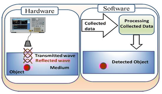 Alternative technology has focused on breast cancer detection research involving Microwave Imaging (MI) in the recent decade to overcome the inconvenience, accessibility, high risk, and cost associated with X-rays and MRI [56,57,58,59]. MI is a nonionizing electromagnetic signals imaging technology that uses frequencies ranging from 300 MHz to 30 GHz [60]. MI provides higher and stronger contrast between healthy tissue and tumors, contributing to tumor identification without the risk of ionization effects (safe medical screening tool) [61,62]. As illustrated in Figure 8, a MI architecture consists of two main components: (i) hardware (antenna) for transmitting and collecting microwave signals that reflect from the breast phantom using Vector Network Analyzer (VNA) or any proper electromagnetic transceiver; (ii) software to rebuild the signals received and stored in a computational tool that contains detection algorithm [63]. The latter uses the power distribution of scattered waves to distinguish between healthy and tumor-containing tissues. MI is a cost-effective procedure since the equipment is often a fraction of the cost of equipment for other diagnostic approaches [64]. The most significant problem is that microwave imaging produces an image with limited spatial resolution [65,66,67]. Microwave tomography and radar-based imaging are the two main types of microwave imaging [68,69].