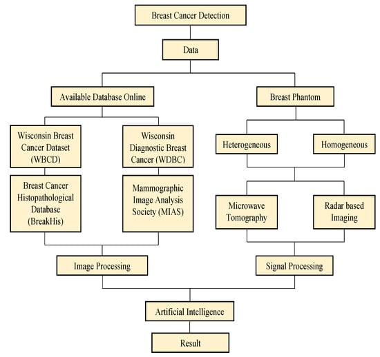 The MARIA® system is a novel technology that utilizes dielectric value to distinguish between tissue types within the female breast. Radiowave radar-based imaging is well-researched, and the unique physiological characteristics of the breast have made it an important research area for radio-wave technology [87]. As seen in Figure 11, this research area divided into two categories: image processing and signal processing. Most researchers using an available dataset that can get through Wisconsin Breast Cancer Dataset (WBCD) will focus on image processing. In contrast, for signal processing, the researcher will start from data collection until processing the result.