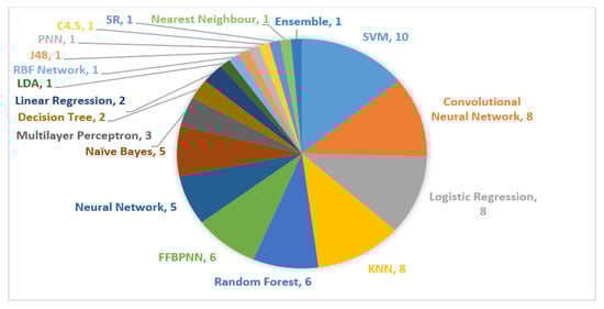 In addition, Table 6 summarize and provides several studies related on breast cancer detection using image and signal processing technique. Based on the review, Figure 12 shows the most frequently used ML methods with different modalities. The the most popular classifiers use is: support vector machine, convolutional neural network, logistic regression and k-nearest neighbour.