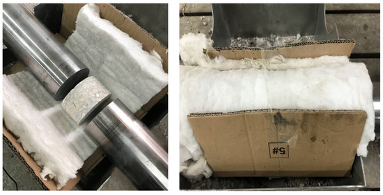 During the high-temperature SHPB test of high-performance concrete, asbestos-wrapped specimens were loaded on the test bench, as shown in Figure 6, to reduce the heat loss of the concrete specimens to the surrounding air and to keep the test specimens in a relatively sealed environment. Thus, the concrete specimen can be kept at a constant temperature during the tests.