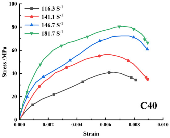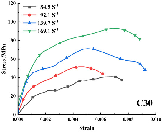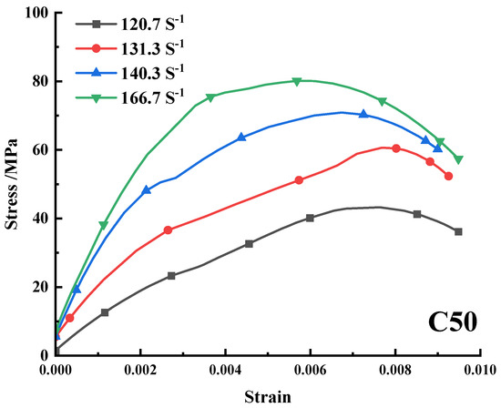 Thus, it can be seen from the stress–strain curves of the specimens that the dynamic compressive strength of the concrete specimens increase with the increase in the strain rate at the same temperature of 300 °C for all three types of HPC—i.e., C30, C40, and C50.
