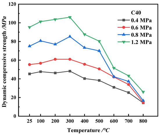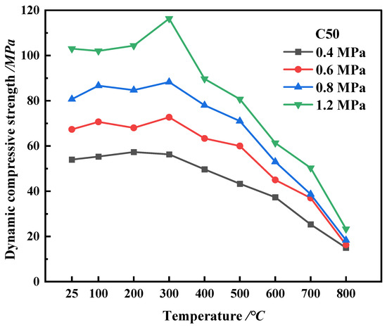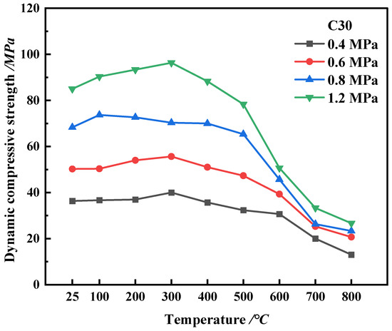 When the temperature of the specimen is below 300 °C, these results indicate that the dynamic compressive strength would increase with the rise in loading rate and reach a peak when the temperature approaches 300 °C. Under the same temperature condition, the dynamic peak stress of the low-strength HPC (C30) does not change much with the increase in temperature. When the loading rate is 0.6 MPa or 0.8 MPa, there are fluctuations. However, when the temperature is above 300 °C, the dynamic compressive strength rapidly decreases. According to the trend across all test results, the dynamic compressive strengths of the HPC specimens show a trend of first increasing and then decreasing. The obtained results agree well with those well documented in the literature in terms of the compressive increasing and decreasing trend at various loading rates and after different high-temperature treatments [4,6,7,58,59].