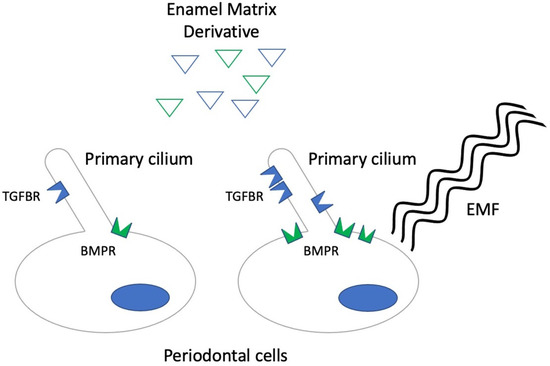 Electromagnetic fields may prove to be a relatively inexpensive support treatment to enhance the effectiveness of EMD in restoring periodontal tissues, such as periodontal ligament, as they have been shown to act on several signaling pathways, and because there is mounting evidence that they can regulate the membrane receptor availability on and around primary cilia. Their action is known to affect BMP receptors, and we hypothesize that it might also affect TGF-β receptors, by controlling membrane trafficking. This, in turn, would make cells more sensitive to the action of BMP and TGF-β growth factors (Figure 1), which are pivotal to the action of EMD, either through paracrine stimulation or through the direct action of some of the protein fractions contained in EMD.