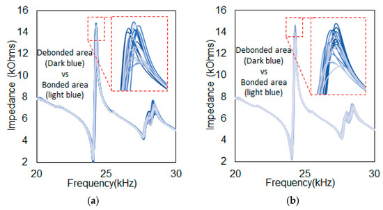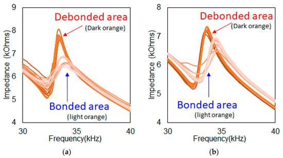 Figure 3 and Figure 4 show all impedance signatures described in the previous section. Figure 3a,b represents the impedance signatures using the re-attachable device where the dark orange-colored lines and light orange colored lines represent debonded and bonded area signatures, respectively. Although variations in signatures can be seen, one can clearly identify the difference between the two groups of signatures. The first observation was that the signatures from the debonded area had higher impedance peak amplitudes compared to the bonded area signatures for both figures. For Figure 3a involving the test on Structure_A, the heights of most of the signatures for the debonded area were around 8 kOhms, where the heights of the signatures for the bonded area were all less than 7 kOhms. Thus one can visually identify the difference between two different areas. Figure 3b shows a similar outcome using a thicker top plate of 0.4 mm where the heights of the impedance signatures from the bonded area had an amplitude of less than 7 kOhms as well. However, when the measurement was taken from the debonded area, the peaks generally shifted in the left direction (from around 35 kHz to 34 kHz), with most of the signatures resulting in over 7 kOhms. The reason for the increase in peak amplitudes when moving from bonded to debonded area is that with the debonded area, the top plate is free to vibrate in the thickness direction, resulting in higher amplitude. This is why with Figure 3b, the peak amplitudes for the debonded area were lower compared to Figure 3a since the thickness was twice the size, restricting vibration in the thickness direction.