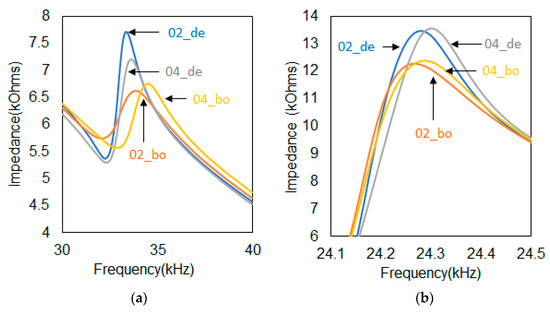 Figure 5a,b shows the averaged impedance signatures for Figure 3 and Figure 4, respectively. The 10 impedance signatures were averaged to create each line shown in the figure. For Figure 5a, the clear difference is seen between impedance signatures where the resonance peak increased from 6.5 kOhms (labeled ‘02_bo’) to 7.6 kOhms (labeled ‘02_de’) when moving from boned area to debonded area. Here, a RMSD of 5.75% was calculated. Next, with the thicker top plate, the resonance peak increased from 6.6 kOhms (labeled ‘04_bo’) to 7.2 kOhms (labeled ‘04_de’) when moving from bonded area to debonded area. Here, a RMSD of 7.51% was calculated. Next, with Figure 5b, since there was a very small difference between the impedance signatures, the graph was zoomed-in between 24.1 kHz and 24.5 kHz to visualize the difference in impedance signatures. With the figure, there is a clear difference between the bonded and debonded areas where the resonance peak increased from 12 kOhms (labeled ‘02_bo’) to 13.5 kOhms (labeled ‘02_de’) when moving from bonded area to debonded area. Here, a RMSD of 2.47% was calculated. Next, with the thicker top plate, the resonance peak increased with a similar height from 12 kOhms (labeled ‘04_bo’) to 13.5 kOhms (labeled ‘04_de’). Here, a RMSD of 2.68% was calculated. Comparing both RMSD values, similar experimental values showed that the thickness did not significantly affect the outcome. However, with the thicker plate of 0.4 mm, we can see that the resonance frequency was higher (right shift) compared to using a top plate of 0.2 mm. This promising outcome shows the possibility of using the proposed roller device for detecting debonding of composite plates.