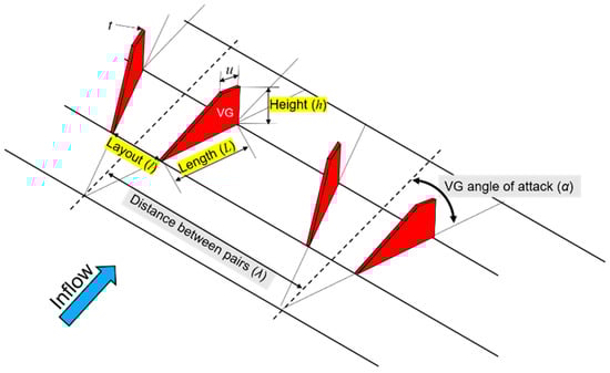Considering the aerodynamics and structural aspects of the blade, the airfoils shown in Figure 1 are extended in the span direction as shown in Figure 2. Figure 3 schematically shows the main parameters and layout of the VG. The distance between the VG pairs (λ) and the angle of attack (α) of the VG were specified as 6° and 11° for efficiency. The recommended λ/h investigated through a flat-plane CFD analysis study is 5 [32]. The VGs are installed on the suction surface and at the root of the blade to enhance the aerodynamic performance. Table 1 presents the wind turbine specification and Table 2 the shape parameters of the VG normalized by the chord length.