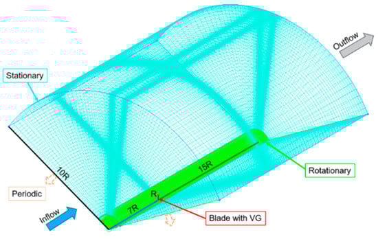 To accurately calculate ω (specific dissipation) in the viscous sub-layer region using RANS simulation with the SST turbulence model, the minimum grid size must satisfy y+ < 1 in the viscous sub-layer simulation [40]. Figure 4 shows the blade calculation area. In the calculation domain, a spatial resolution of 7 times the rotor radius in the inflow direction, 10 times the wake direction, and 10 times the radial direction was configured. A no-slip condition was applied to the blade surface equipped with the VG, and a freestream condition was applied to the inlet. The flow field of the wind turbine blade was simulated by applying a 120° periodic boundary condition in the direction of rotation. The interface between the rotating and fixed parts was analyzed by applying the frozen interface condition.