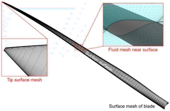 The results of the CFD analysis of the wind turbine blade without a VG were compared with experimental BEMT data. The BEMT-based analysis was carried out using GH Bladed, which is commercial code used for wind turbine design. Figure 4 and Figure 5 shows the computational grid system of the blades in the simulation, and Table 3 provides the number of elements in the computational grid system used for the simulation. Figure 6 and Table 4 present the results of the CFD analysis of the blade and the GH Bladed design values. These results are confirmed to be consistent within a margin of error of 0.24% at a wind speed of 7.5 m/s and 2.36% at a rated speed of 10 m/s.
