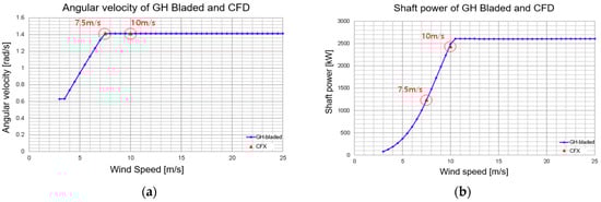 Comparison of the results of the angular velocity and axis output computed using GH Bladed design data and CFD. (a) Angular velocity. (b) Shaft power.