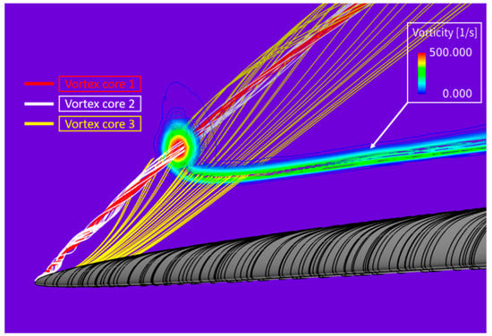 The simulation was performed by specifying many grids in the wake direction of the blade tip to accurately simulate the tip vortex, and these results are shown in Figure 7. Vortex core 1 is generated in the boundary layer of the suction surface, and vortex core 2 is combined with vortex core 1 in the boundary layer of the pressure surface. Vortex core 3 is a boundary layer generated at the blade trailing edge and is swept into the tip vortex structure. As shown in Figure 8, large-scale flow separation occurred at a distance of approximately 20% of the chord length from the leading edge. The airflow characteristics on the suction surface of the blade were affected by the thickness ratio of the airfoil and the angle of attack depending on the wind speed. The flow-separated low-energy air was confirmed to flow secondarily in the tip direction along the suction surface owing to forces such as the centrifugal force, Coriolis force, and pressure difference in the radial direction of the rotor.