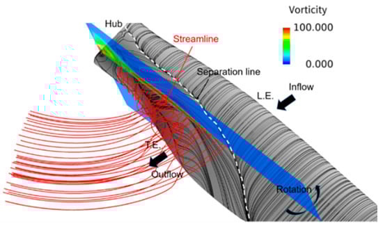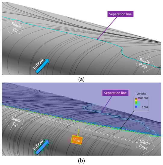 Separation line and surface streamline of blade (a) without VG and (b) with VGs.