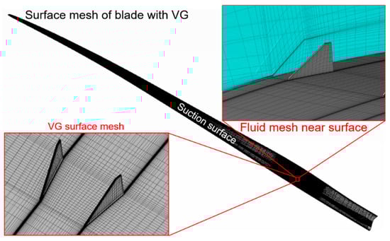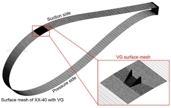 Based on the results of the CFD analysis, the cross-sectional DU airfoil in the region where flow separation occurs predominantly was selected as the test airfoil for VG application analysis. Figure 9 shows the surface grid of the VG-equipped airfoil used for simulation, and Table 5 contains the number of grids that were used.