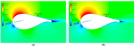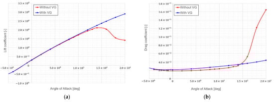 The chordwise velocity contours of the airfoil with and without the VG are shown in Figure 10a,b. The results of the CFD analysis confirm that, in the case of the airfoil without the VG, the fluid did not accelerate along the suction surface and flow separation occurred; however, in the case of the airfoil with the VG, the fluid accelerated along the suction surface and flow separation did not occur. When flow separation occurs on the suction side, a low-pressure region is formed in the wake, which lowers the lift coefficient and increases the drag coefficient. As shown in Figure 11a,b, when the VG is attached, the airfoil experienced a high lift force at an angle of attack of 5.9° or higher and a low drag force at an angle of attack of 14.8° or higher.