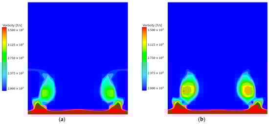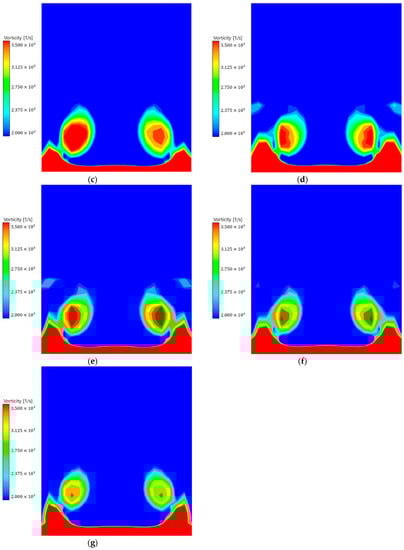 The design variables and layout of the VG are shown in Figure 3, where the thickness t is fixed at 0.05 and the length of the upper section u is fixed at 0.2. A total of 27 CFD analyses were performed, and the variables used in each of these cases are listed in Table 6. In the analyses, the Reynolds number and angle of attack were set to 3.0 × 106 and 12°, respectively. The results of these case studies are presented in Table 7. Figure 12 and Figure 13 show the vorticity contours for cases 1, 2, 3, 5, 8, 11, and 20 at locations 50% and 100% of the chord length from the leading edge, respectively. In Figure 13, the vorticity contour at the trailing edge can be compared when each parameter is changed based on case 2.