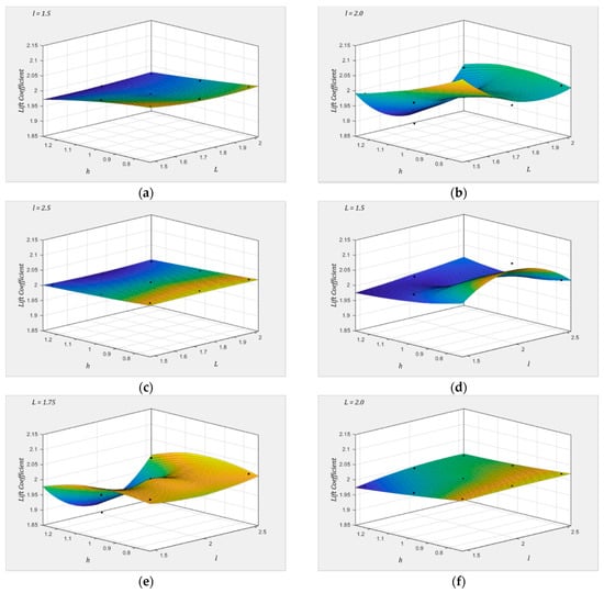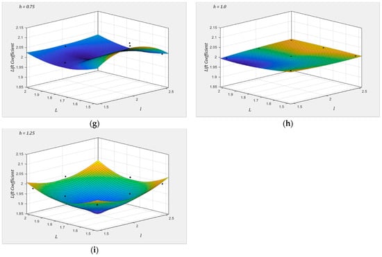 Surface plots of CL showing the effect of three parameters on the lift coefficient: (a) l = 1.5; (b) l = 2.0; (c) l = 2.5; (d) L = 1.5; (e) L = 1.75; (f) L = 2.0; (g) h = 0.75; (h) h = 1.0; (i) h = 1.25.