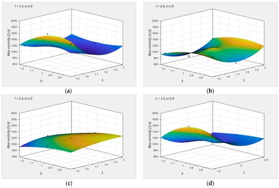 The response surface methodology (RSM) used a LOWESS (Locally Weighted Scatterplot Smoother) second equation to find combinations that could represent the best VG effect using the three independent design parameters, layout (L), length (l), and height (h), as shown in Figure 3 [41]. Four objective variables, , , and the maximum vorticity at the positions 50% and 100% from the leading edge to the trailing edge, were investigated. The correlation between the values is shown for these cases in Figure 14 as 3D surface plots. In this figure, the value calculated for tends to be higher as the length (L) is closer to the median value and the height (h) and layout (l) are lower. The correlation between the maximum vorticity values of the trailing edge is also shown in terms of the three parameters in Figure 15. Unlike , the calculated value of the maximum vorticity of the trailing edge tends to be higher for l, lower for L, and that of h is closer to the median value. The VG design parameter selection criteria, more weight assigned to the maximum vorticity at the trailing edge, and the parameters were selected as shown in Figure 3 in consideration of manufacturability.