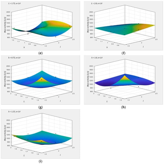 Surface plots showing the effect of three parameters on the maximum vorticity at the trailing edge: (a) l = 1.5; (b) l = 2.0; (c) l = 2.5; (d) L = 1.5; (e) L = 1.75; (f) L = 2.0; (g) h = 0.75; (h) h = 1.0; (i) h = 1.25.