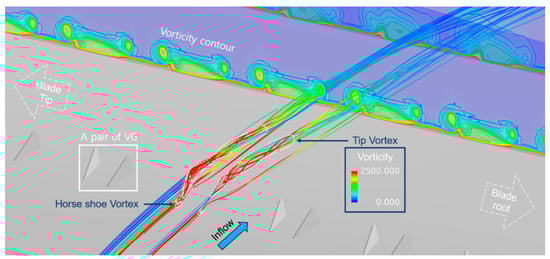 - Analysis of the flow characteristics of the blade with the mounted VGs confirmed that the tip vortex generated by the VG reduced the separation area by allowing the high-energy fluid to flow to the low-energy separation area.