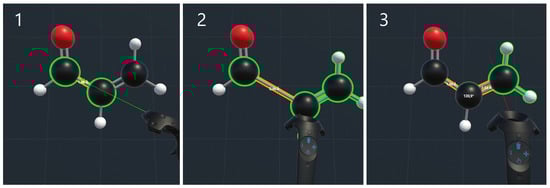 New atoms and bonds are created with a right hand pinch gesture or trigger press, emulating a mouse left click—demonstrated in Figure 6. When performing the create-action in empty space, a new atom is spawned at either the tip of the index finger of the virtual hand model or circa 5 cm in front of the controller. The element of the created atom can be selected from the menu. For elements with the necessary parameters set in a configuration file, the created atom is saturated with bonded hydrogen atoms in accordance with the VSEPR theory, if this functionality is turned on from the application menu. Performing the create action while pointing at or touching an existing atom will replace the referred atom with one of the user-selected elements. The new element inherits all bonds from the replaced atom, and while no existing bonds are removed, if the inherited bond count is less than dictated by VSEPR theory for the new element, extra hydrogen atoms are added automatically. Finally, starting the create action while pointing at an atom and dragging and releasing it over another creates a new single bond between the atoms. Bonds are modified through the same touch-and-pinch or point-and-click gestures, which cycles between a single, a double and a triple bond. With “Auto Saturation” enabled, hydrogen atoms are added or removed as necessary, and other bonded atoms are left unmodified. This building logic is used in many applications and allows quick molecule modeling. The mechanics of this scheme are also already familiar to most chemists and the familiarity should be transferable between software for most users. The control scheme also minimizes menu interactions while building molecules and offers a fluid workflow.