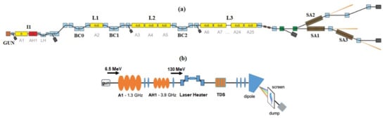 Specifically, a primary goal of start-to-end simulations is to find a suitable working point, allowing bunch compression to the target peak current while maintaining as well as possible the bunch qualities obtained from the injectors. Essentially the working point refers to a set of longitudinal beam dynamics parameters such as the R56s and beam energies at the bunch compressors, and also a set of RF parameters, including amplitudes and phases of the acceleration modules, namely A1, AH1, L1 and L2 as shown in Figure 1a. In the following, we employ a parameter set of −44 mm, −50 mm and −30 mm as the R56s at the bunch compressors BC0, BC1 and BC2 as shown in Figure 1a, respectively. The mapping between the RF parameters and the longitudinal beam dynamics parameters is described in []. It can be noted that dedicated high-resolution simulations are performed in IMPACTZ [] with a real number of electrons to numerically resolve the micro-bunching effect by the so-called brute-force technique. This allows a determination of the ratio between the peak current and the energy spread at the end of the accelerator beam line with respect to an optimal laser heater working point [,]. The optimized ratio is then set as a goal for further optimization of the RF parameters as well as the mapping between the RF parameters and the longitudinal beam dynamics parameters in OCELOT []. More details about this approach will be published elsewhere, for example, in [].