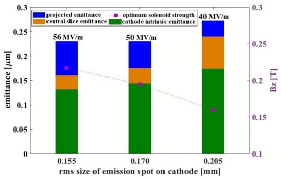 Figure 4 shows the optimized overall transverse projected emittance for 100 pC electron bunches at the injector exit using peak accelerating gradients of 56 MV/m, 50 MV/m and 40 MV/m at the cathode. The 56 MV/m case is close to an optimal state of the present operation with the pulsed injector at the European XFEL. The lower gradients, 50 MV/m and 40 MV/m, would have relevance to the case with a CW injector, in which the peak accelerating gradient is reduced to 40 MV/m with a potential improvement to 50 MV/m in superconducting RF guns [,]. The beam energy at the gun exit is reduced from about 5.96 MeV in the 56 MV/m case to 5.28 MeV and 4.21 MeV for the 50 MV/m and 40 MV/m cases, respectively. The optimal solenoid field strengths for each optimized case are shown on the right axis of Figure 4. It can be seen, that at a reduced cathode gradient of 50 MV/m, the optimal transverse projected emittance (blue bars) is still comparable to the 56 MV/m case. The comparable emittance is achieved by increasing the laser spot size to relax the volumetric space-charge density. While this comes at the cost of higher intrinsic emittance (Figure 4, green bars), the stronger space-charge effects at lower cathode fields are mitigated to a similar extent. However, the central slice emittance (orange bars) at 50 MV/m is increased, implying the slice formation of the bunch is still affected at a lower cathode gradient and could not be fully compensated. By further decreasing the cathode gradient to 40 MV/m, one can see that both the transverse projected emittance and the central slice emittance are degraded. It should be noted that an increase of the cathode laser pulse length may be able to compensate for the overall emittance growth at 40 MV/m. However, since this study aims to evaluate the injector performance under the conditions more close to practical operation of the facility, further lengthening and/or shaping of the temporal cathode drive laser distribution is not considered. As a reference, in previous facility operation at 100 pC, the projected transverse emittance is typically about 0.33 μm at a nominal gun gradient of about 56 MV/m, which is measured by the quadrupole scan method. This is about 30% higher than the optimized emittance one can achieve in the simulations as presented in this paper. One discrepancy source may attribute to the fact that the transverse pulse shape of the cathode drive laser is not yet experimentally optimized. Yet another source can be related to the non-uniformity of the photocathode quantum-efficiency map due to an aging effect.