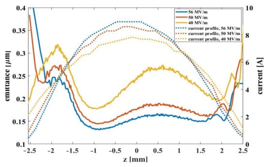 Figure 5 shows the slice emittance along the bunches at the three peak accelerating gradients under consideration. A central slice emittance growth around the current peaks with respect to the 56 MV/m case is about 6% at 50 MV/m and 30% at 40 MV/m. The peak currents are about 9.0 A, 8.5 A and 7.8 A by the end of the injector for 56 MV/m, 50 MV/m and 40 MV/m, respectively. Furthermore, an FEL gain parameter is defined according to [] to evaluate potential SASE performance of individual slices along the bunches, in terms of bunch quality parameters, that is, =/, where stands for the current and represents the slice emittance. Figure 6 illustrates the defined normalized gain parameter along the three optimized bunches. A higher gain parameter indicates higher peak current over smaller slice emittance of the bunch segments. As compared to Figure 5, the peaks in the gain parameter are shifted away from the current peaks towards the slices with lower emittance implying a dominating role of the emittance of the produced bunches. The gain parameter of the central slices reduces with decreasing the cathode gradient. However, in this case, the uniformity of the gain parameter turns out to be better in the case of lower gradients.