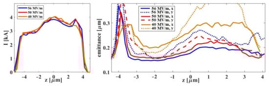 Figure 7 shows the current profiles (left) and the slice emittance (right) along the three optimized electron bunches in front of the SA1 undulators [see Figure 1a]. As shown, the working points are found for all three cases, such that the peak currents close to 4 kA can be reached after the compression with a peak energy spread of about 2 MeV. The final slice emittance are obtained tracking the bunches generated with different accelerating gradients at the cathode through the whole accelerator beam line. The 56 MV/m case shows the lowest horizontal emittance. When reducing the cathode gradient down to 40 MV/m, a degradation in emittance can be seen. A stronger emittance growth in the vertical direction is observed. This may attribute to the impacts of the optics on CSR-related emittance growth in the bunch compressors [,]. The optics are not explicitly optimized in this study. However, it can be seen that the central slice emittance is reasonably well conserved with respect to the emittance in the injector, leading to a central slice emittance of about 0.24 μm at 56 MV/m and 50 MV/m, and of about 0.33 μm at 40 MV/m.
