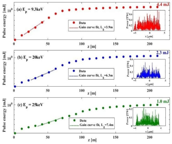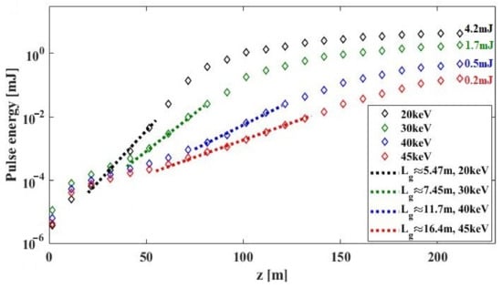 However, the FEL performance depends on the achievable qualities of electron beams in the undulators. The transverse coherence depends on the ratio of geometric emittance to photon wavelength []. The FEL gain length increases with the increase of the transverse emittance and uncorrelated energy spread of the electron bunch, and decreases with an increase in peak current []. The obtained gain length should be sufficiently small, such that the SASE process at a resonant wavelength can grow within a given undulator length until saturation. Typically, an undulator length of about 20 times the obtained gain length allows to stably deliver high-power photon beams to the users at a suitable wavelength.