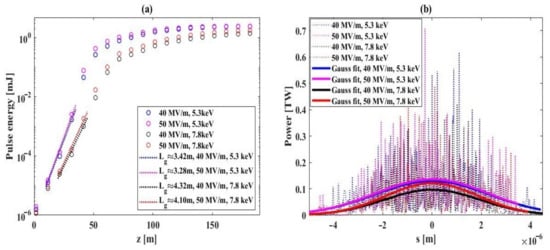 Additionally, in light of global developments towards continuous-wave (CW) operation [,,,,,,,] of FEL facilities at LCLS-II, SHINE, MariX, and so forth, a potential dual-mode operation of the European XFEL is under consideration. This refers to a present pulsed operation mode with a duty cycle of about 1%, that is, a burst of up to 2700 bunches within a 0.6 ms-long 10 Hz-repetition bunch train, and a CW mode at 100% duty cycle. Compared to the pulsed mode, both the cathode accelerating gradient and the total beam energy are reduced in the CW mode [,,]. Therefore, the SASE performance of a potential CW mode, operating at reduced cathode gradients of 40 MV/m and 50 MV/m and a reduced final beam energy of about 7 GeV, is studied in parallel to the pulsed mode of the present machine. This aims to justify the electron bunch qualities under distinct working-mode scenarios. It should also be pointed out that only the existing undulators at the European XFEL with a period of 4 cm are taken into account for computations. Detailed design studies of a complementary CW mode with requirements and considerations of modifying the present facility will be reported in [].