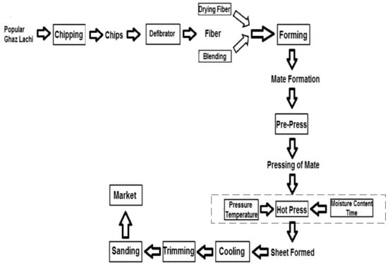 Figure 1 shows an overview of all the major processes involved in MDF manufacturing. This includes raw material collection, chipping, defibrating, forming, pressing, product finalizing, and shipment to the market [2]. With the introduction of industrial wood-based panel manufacturing, most researchers initially focused on the technical and economical optimization of both processes and products [3]. Nowadays, customer demands for sheets are steadily increasing. There are two ways to meet such needs: either by performing various experiments on MDF boards or by developing model simulation [4]. The variation in density at different positions in the fiber mat is of major concern because of the consequent variations in mechanical properties. Input temperature, pressure, cycle time, and moisture content in hot pressing determine the physical and mechanical properties of the manufactured MDF board [5]. A large number of boards (nearly 10–15%) or about one hundred thousand cubic meter per year are rejected in the market due to defects, such as weak internal fiber arrangement, low bending and internal bonding, sides looseness, delamination problems, and rough surfaces [6]. The major reason for these defects is the lack of appropriate understanding of the inter-relationship during the hotpress process among the initial process parameters, such as temperature, moisture content, platen pressure, and its impact on the properties of the board [7]. Consequently, the process optimization of MDF is important to overcome all of these issues. A viable solution is to develop a relationship between the hot press process parameters and its output results [8]. A number of researchers have examined the parameters of hot pressing during operation, while our study focusses on the parameters in the hot press only. In this research, the experiments are performed on 16 mm MDF board [9]. To perform the experiments, a long piece of 8 × 4 feet MDF board is taken, and it is further divided into smaller pieces according to the requirements of lab tests. Furthermore, the vertical density profile (VDP) is a critical factor that determines the strength and quality of MDF panels [10]. The concept of the ratio of the modulus of bending of one layer to the sum of the modulus of bending of all layers in the previous time step, as previously given by Suo and Bowyer [11], is redefined according to the latest published findings. The equation given by Carvalho et al. is used to calculate the modulus of elasticity of different layers of the fiber cake. This model gives an improved relationship between the peak and core densities at a low hot press platen temperature at 160 °C but with an increase in hot platen temperature to 198 °C, where the rise in peak density is comparatively high [12]. The results of laboratory studies indicate that the vertical density profile of MDF is made from a combination of processes that occur both during compaction and also after the press has reached its final position [13]. Medium density fiberboard’s strength, hardness, and other important properties are determined by its vertical density profile, which is one of the most important factors that is determined in laboratory tests of MDF performance. This factor is the combination of the results of many process parameters [14]. During hot pressing, the internal condition of the sheets, temperature, and moisture content continuously change with time [15]. A one-dimensional computer model depends on fundamental analysis, which shows the relationship between process parameters and density profile arrangement. Such parameters are important board characteristics that correlate with the properties of the MDF board [16]. MDF boards with appropriate VDPs are created with careful determination and accurate pressing plan. Existing MDF in the wood market faces issues in regard to moisture, dampness, primary execution, and toughness [17]. Producing quality MDF products that satisfy customer requirements will definitely result in a notable increase in profit for the industry as well as enhancement of the credibility from the perspective of customers [18]. In the last few decades, many researchers have worked on MDF board properties, i.e., bending, thickness swelling, internal bonding, and occurring chemical changes, but only a few studies have examined the vertical density profile of MDF board mathematically. The aims of this study are to increase the bending and internal bonding strength of MDF board, to experimentally study its vertical density profile under varying hot press parameters, and to determine how its peak and core densities are affected by various hot press parameters.