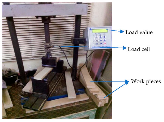 This test measures the bending of MDF boards. Five pieces with dimensions of 50 × 400 mm were used in the wood testing machine for the internal bonding and bending test. The maximum applied uniform load with a consistent speed toward the point of convergence of MDF prior to failure measured the bending and internal bonding [21]. For internal bonding critical tests, five work pieces with dimensions of 50 × 50 mm were used. Figure 3 shows the wood testing machine used for the bending test, while Figure 4 depicts the internal bonding test.